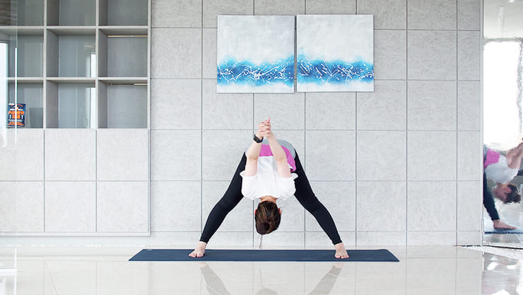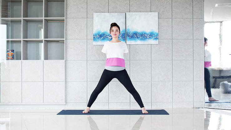 - 足を大きく開き、背中の後ろで指と指を絡めます。肩甲骨を引き寄せ合い胸を開きましょう。