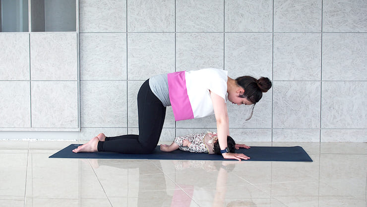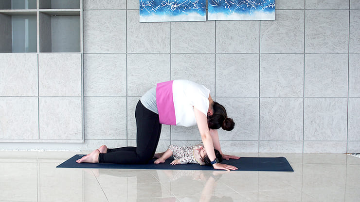 ※赤ちゃんと一緒に行う場合は四つん這いになった時に目が合うように赤ちゃんをゴロンと寝かせます。動けるお子さんはママのポーズを真似しながら一緒に動いてもらいましょう!