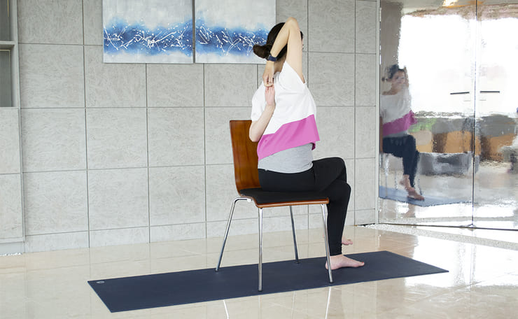 5、息を吐きながら右肘を曲げます。余裕があれば左右の指先同士を引っ掛けるようにして引っ張り合います。